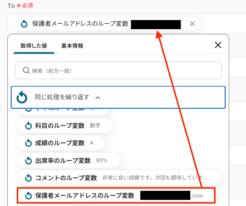 次の画面で、「繰り返し対象の取得した値」を設定します。
