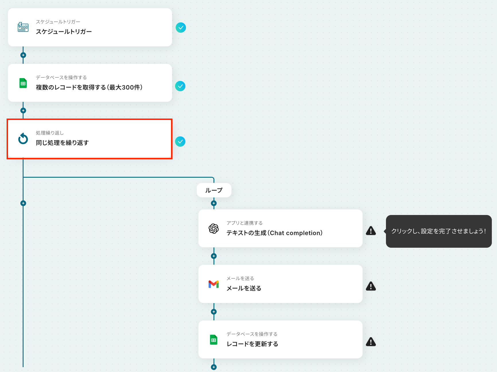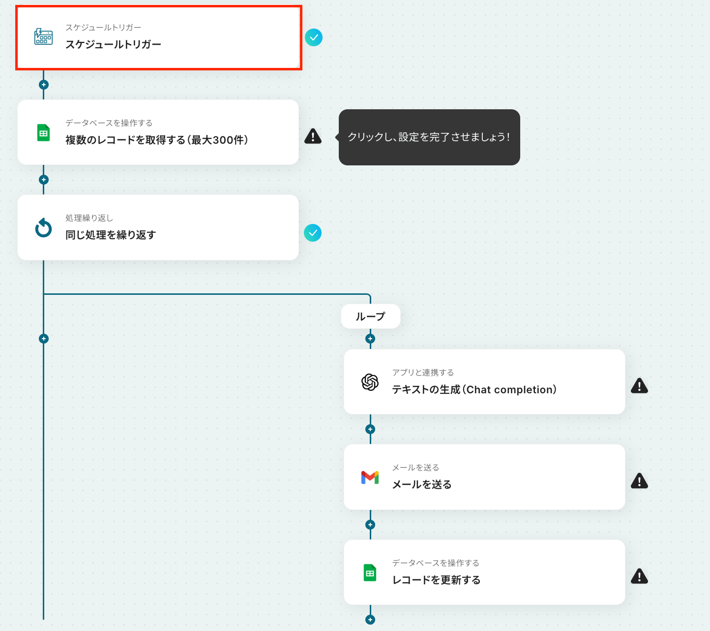 ここから「定期的にGoogle スプレッドシートの学習進捗をOpenAIでまとめ、保護者にGmailで自動通知する毎朝Todoistの完了タスクを検索し、一括で再開する」フローの設定をしていきます!