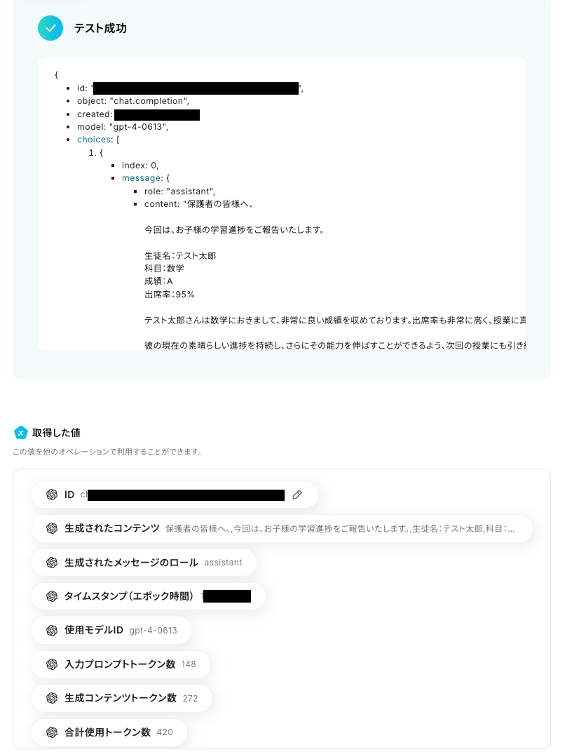 「メッセージコンテンツ」には、OpenAIへの指示内容を入力しましょう。