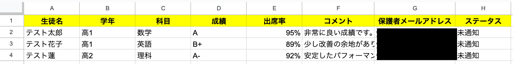 今回は以下のシートを使用します。「成績・出席・進捗コメント」などを蓄積している想定です。