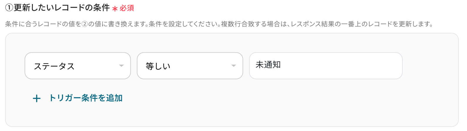 ここで指定した条件に合致した場合のみ、レコードの更新を行います。今回は「ステータス」が「未通知」の場合、更新するように設定しました。