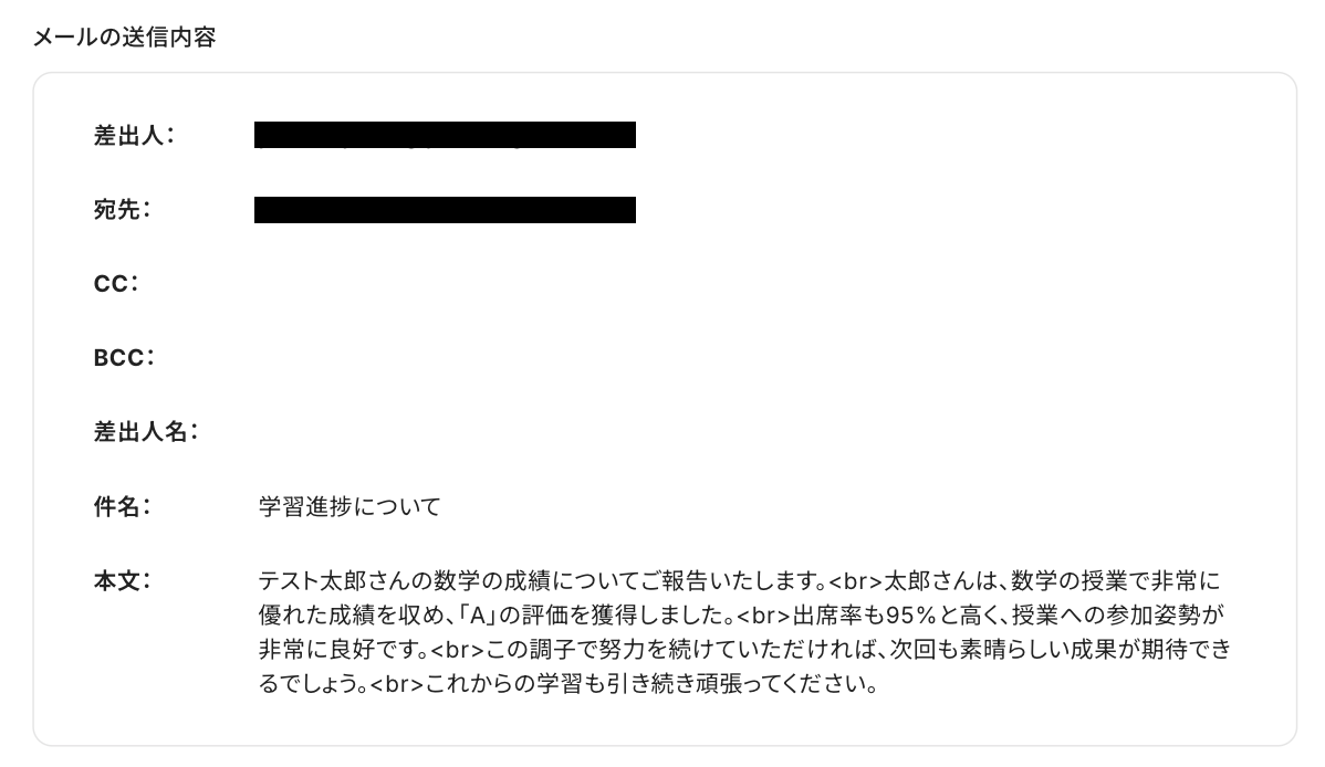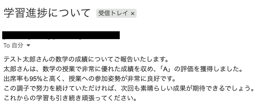 例えば、「成績が基準以下の生徒の保護者には、面談を促す一文を追加してください」といった指示も設定できるため、個々の状況に応じた通知文を作成することが可能です。