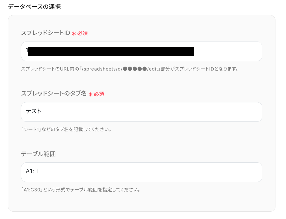 「テーブル範囲」は、Google スプレッドシートの対象となる範囲を英字で設定してください。