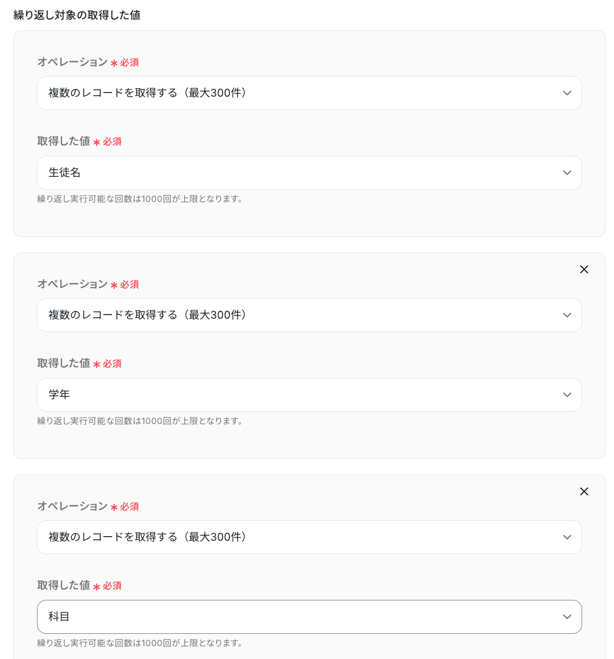 「オペレーション」は、「複数のレコードを取得(最大300件)」を選択してください。