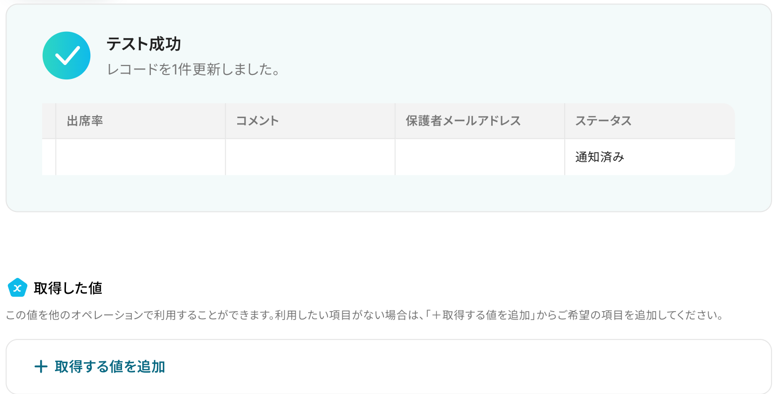 今回は、「更新したいレコードの条件」に複数行合致したため、レスポンス結果の一番上のレコードのみを更新します。
