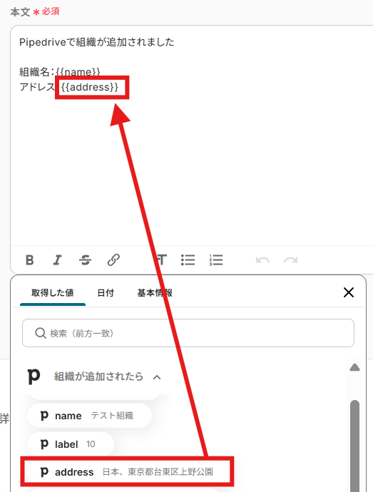 - メールの件名や本文には、固定のテキストだけでなく、トリガーで取得したPipedriveの組織名などの情報を変数として埋め込むことができます。