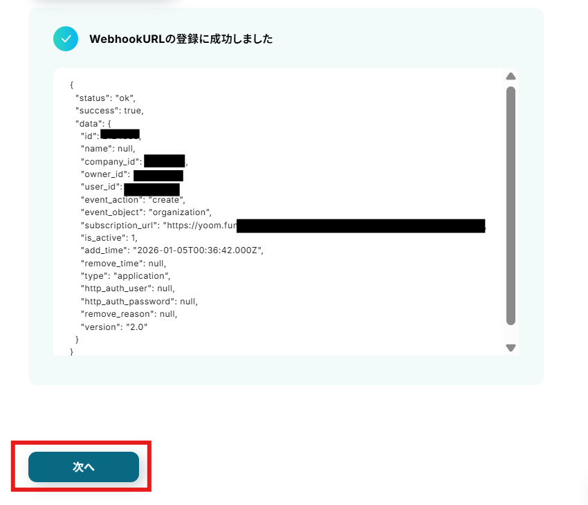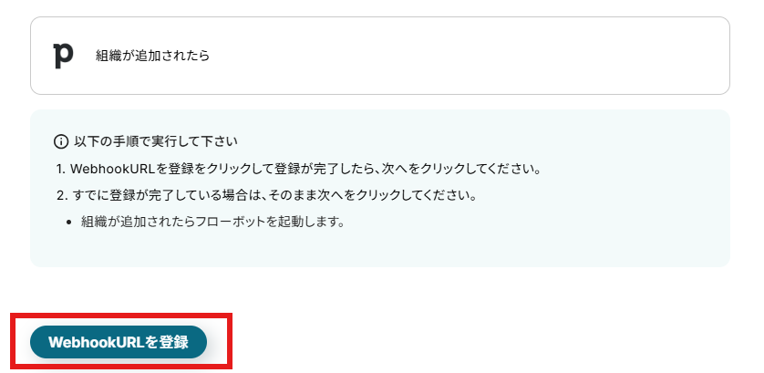 「WebhookURLを登録」をクリックし、WebhookURLの登録に成功したら「次へ」で進みます。