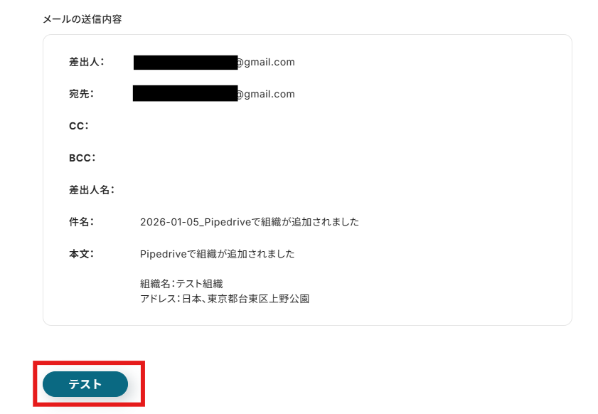 テストが成功したら宛先に指定したアドレスを確認し、問題なくメールが届いていればOKです。
