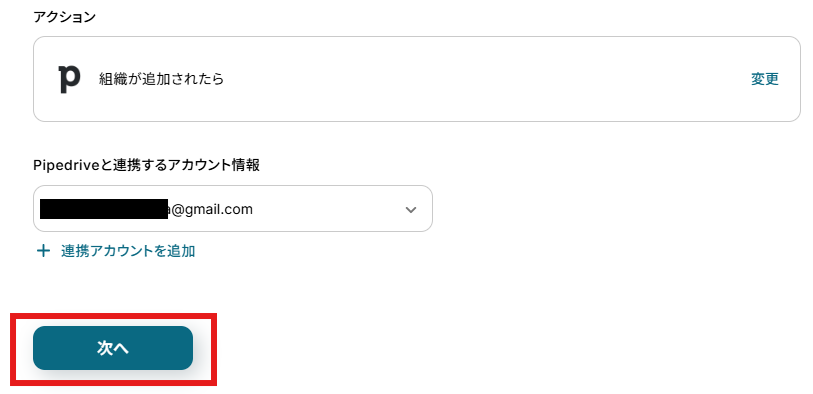 - 次に、トリガーでPipedriveを選択し、「組織が追加されたら」というアクションを設定します。