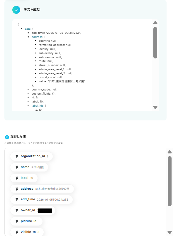 組織の追加が完了したらYoom設定画面に戻り、テストボタンをクリックしましょう。テストが成功し、取得した値が入ればOKです。