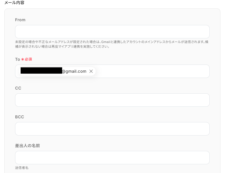 - Gmailでメールを送信するアクションでは、通知先のメールアドレス(To, Cc, Bcc)を任意で設定することが可能です。