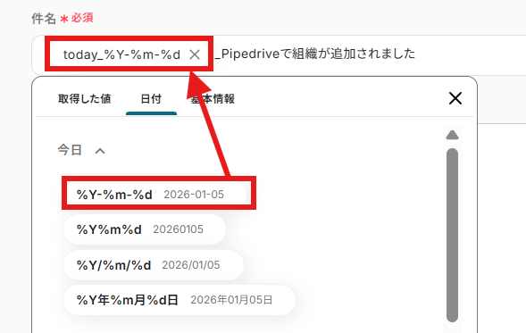 件名、本文は「日付」や「取得した値」を使用してわかりやすく設定してください。