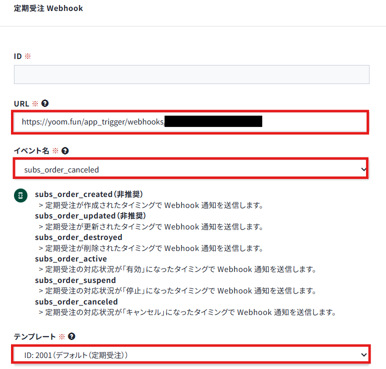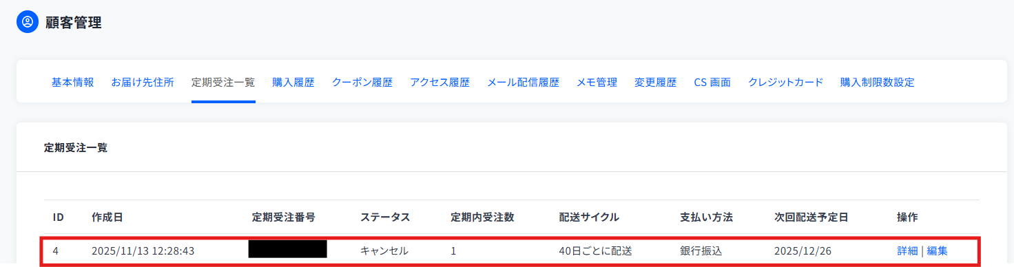 Webhookの情報を保存したら、次にテスト可能な顧客に定期受注を作成し、キャンセル処理を行ってください。
