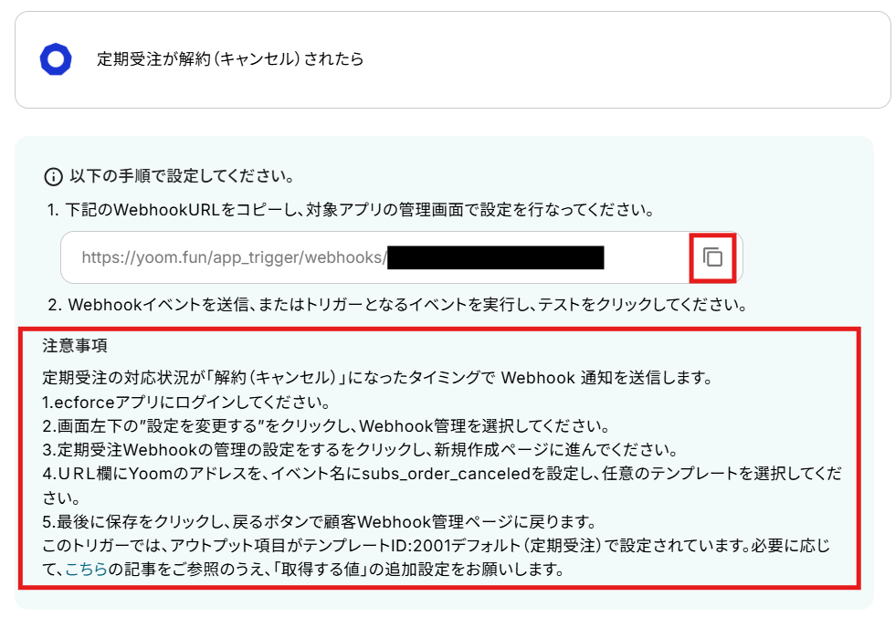 まずecforceのアクションをYoomと連携するために、ecforceにWebhookを設定します。