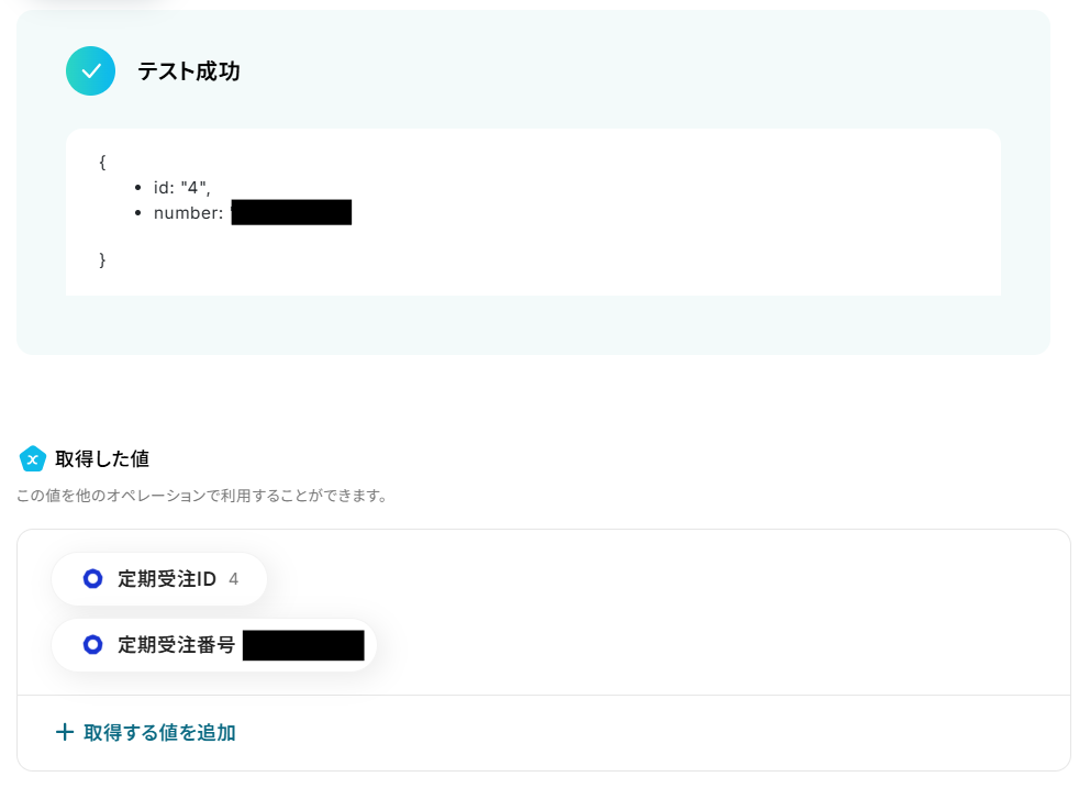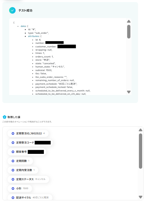 テストが成功すると取得した値の横に、ecforceでキャンセル処理した定期受注の基本情報が表示されます。