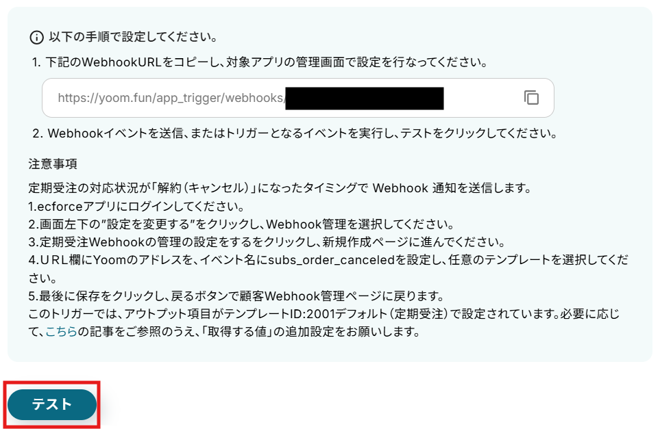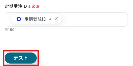 定期受注のキャンセル処理ができたら、Yoomの操作画面に戻り、「テスト」をクリックします。