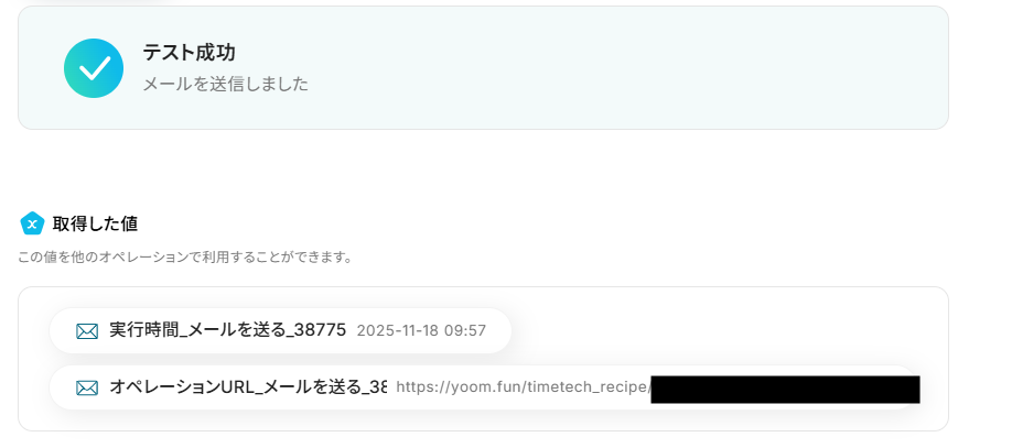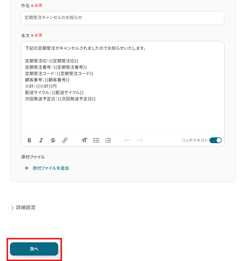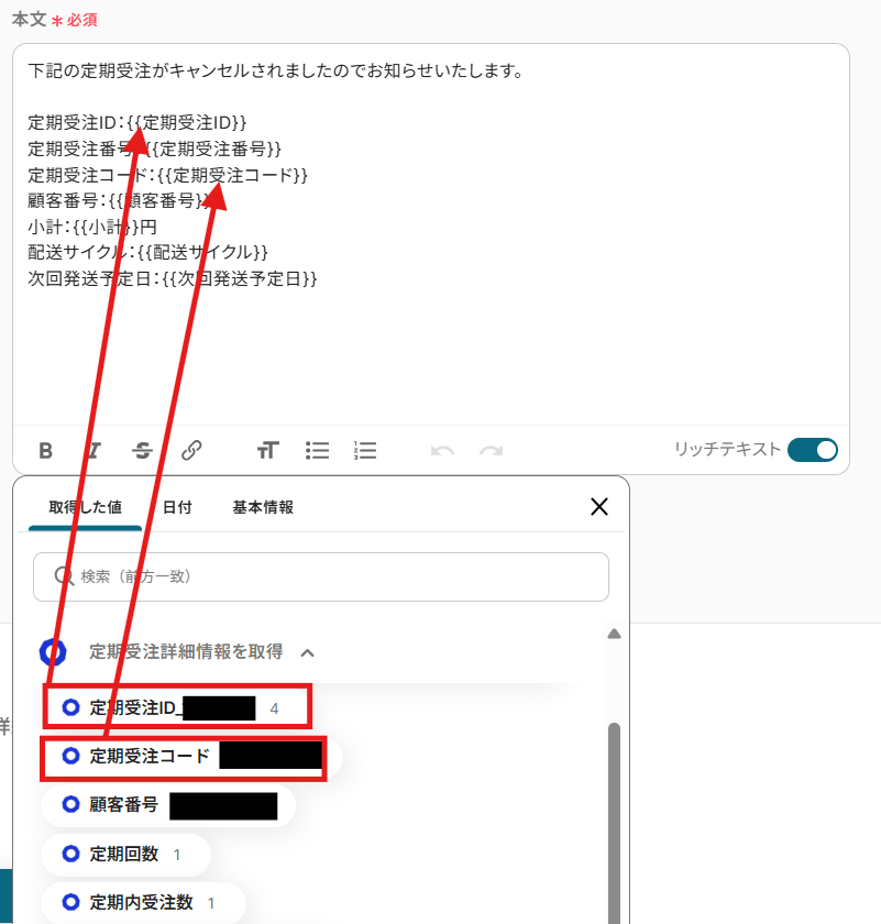テキストを直接入力した部分は固定値として処理されるため、毎回変動が必要な情報({{定期受注ID}}や{{定期受注番号}}など)には取得した値を活用することが重要です!