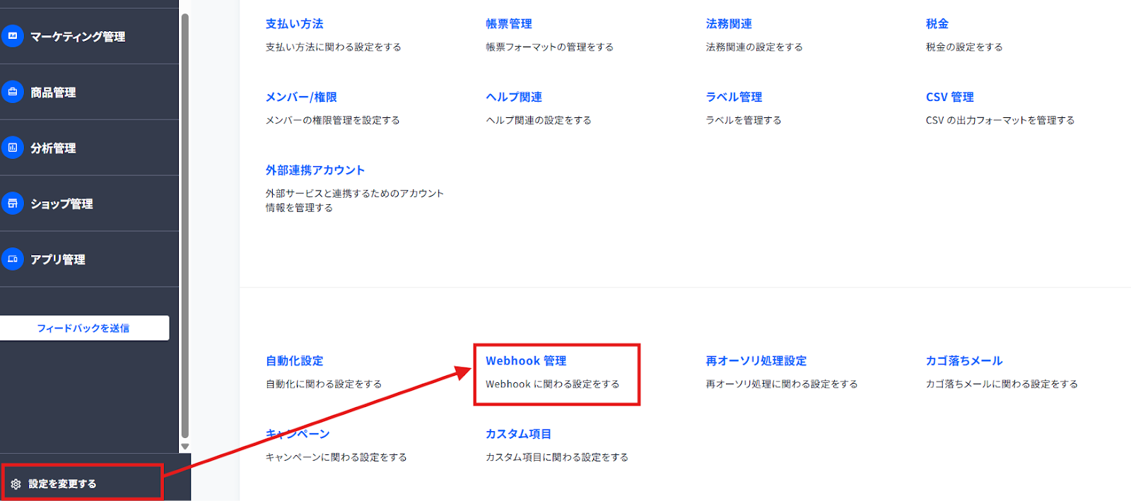 ecforceにログインしたら、「設定を変更する」をクリックして、「Webhook 管理」を選択します。