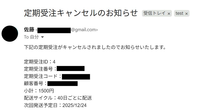 テストが成功して、ecforceでキャンセル処理した定期受注の詳細情報を取得できました!