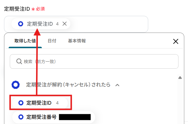 編集欄をクリックして、「定期受注が解約(キャンセル)されたら」から「定期受注ID」を選択してください。
