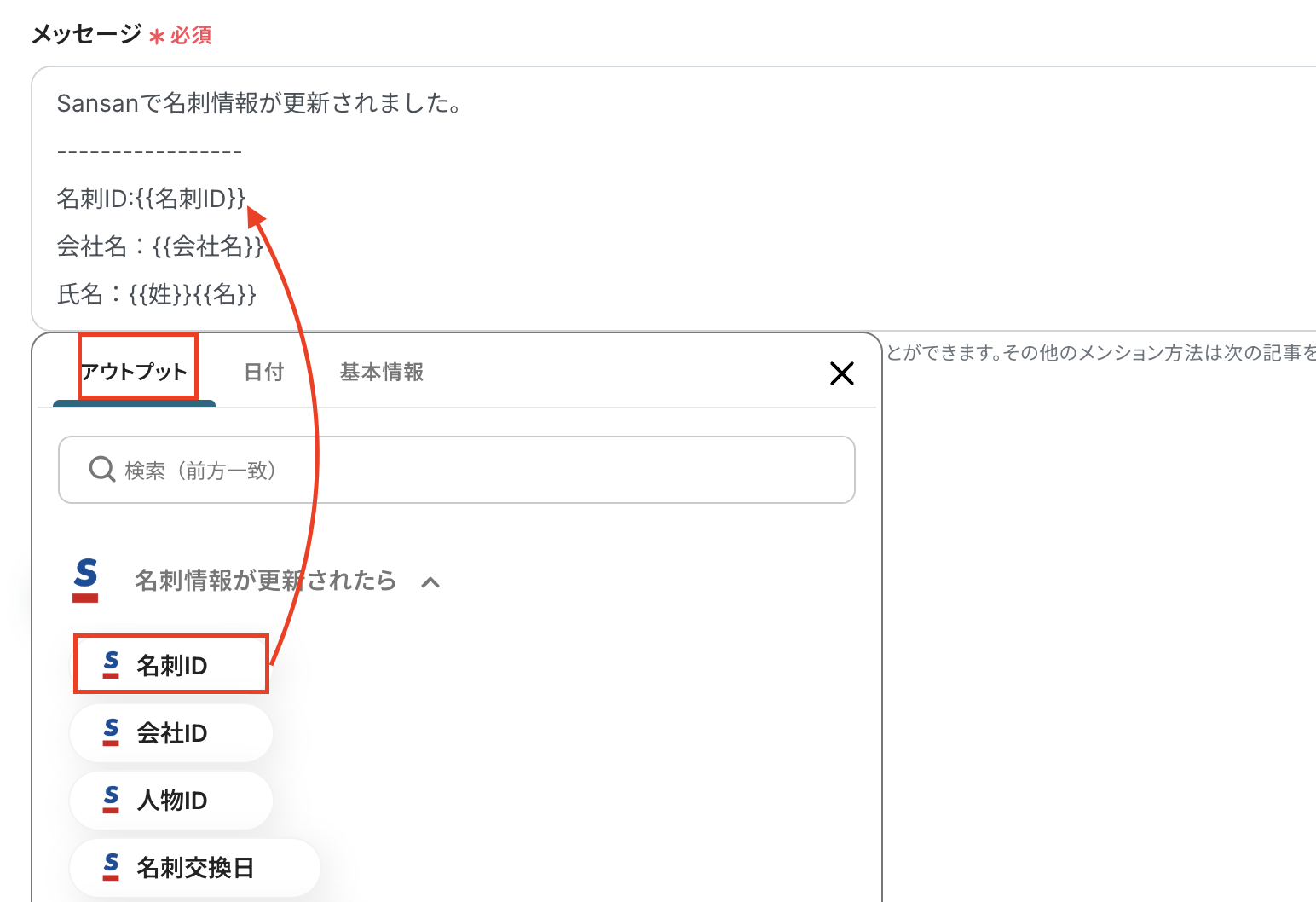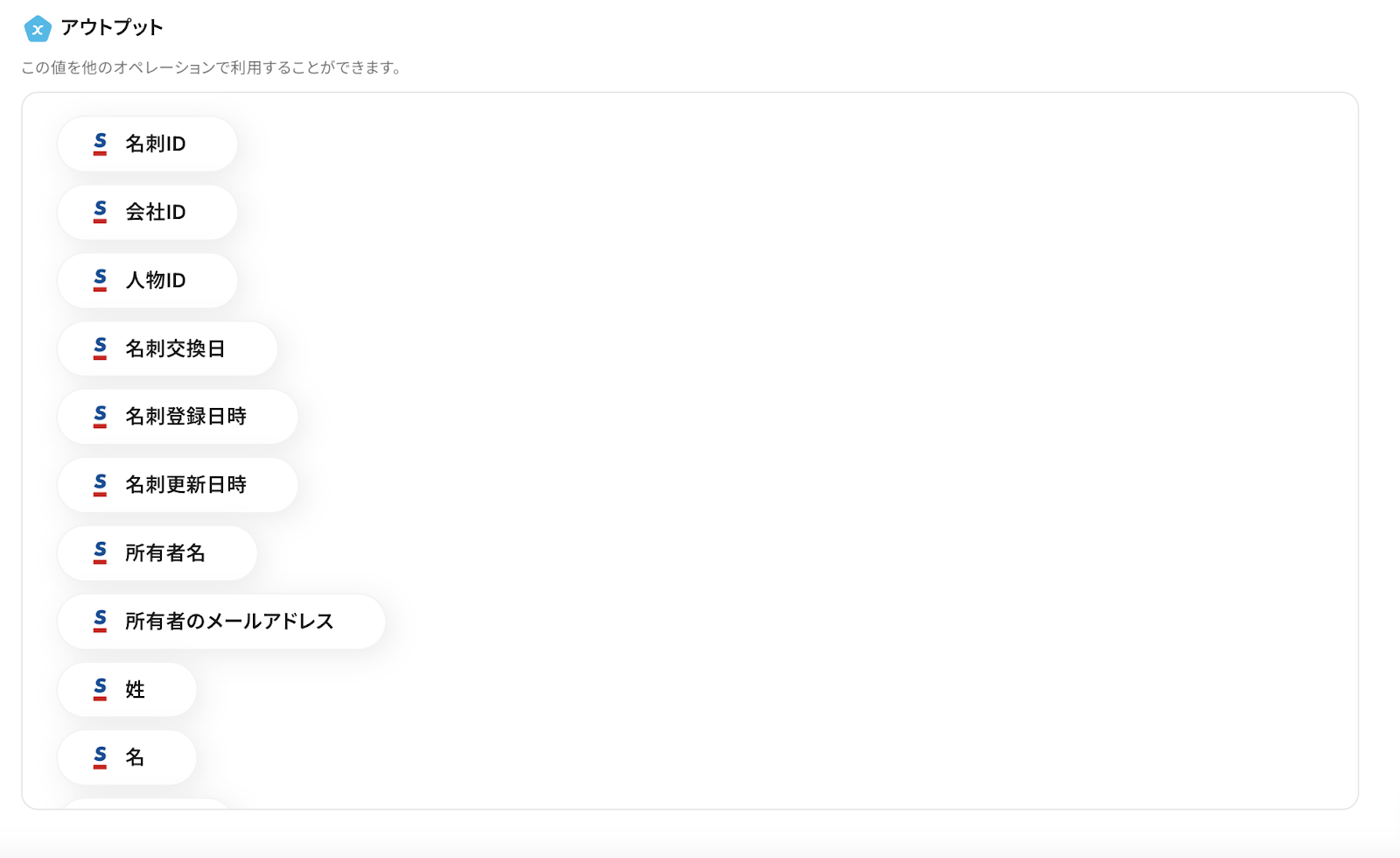 アウトプットを活用すれば、手動で値を変更する必要がなくなり、名刺情報が更新される度に情報が更新されます。