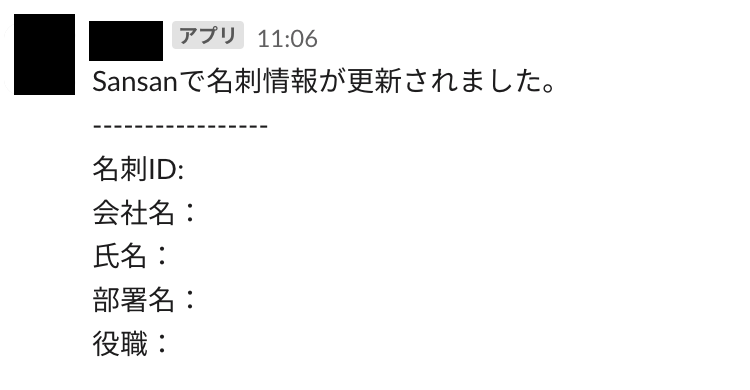 また、アウトプットを使用せずにメッセージを作成することも可能ですが、名刺の更新だけではなく、更新された名刺情報を通知することで、Slack上で容易に確認することができます。
