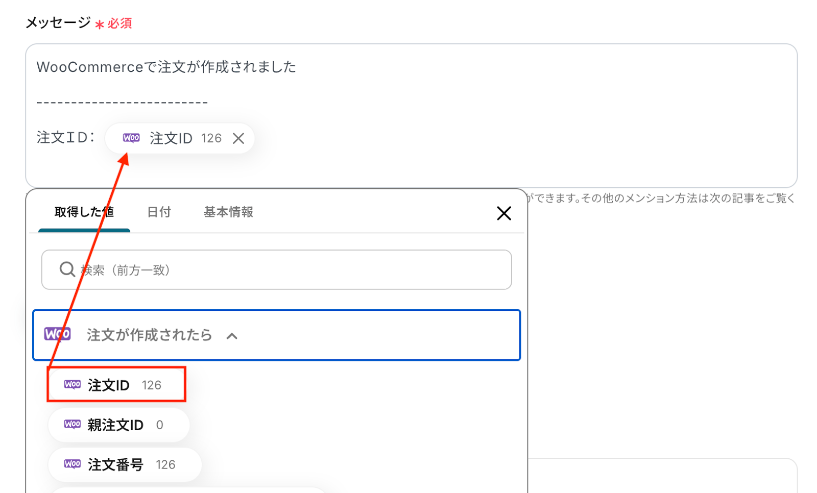 入力欄をクリックすることで、前のステップでWooCommerceから取得した値を挿入でき、任意のテキストと組み合わせて自由にメッセージを作成できます。