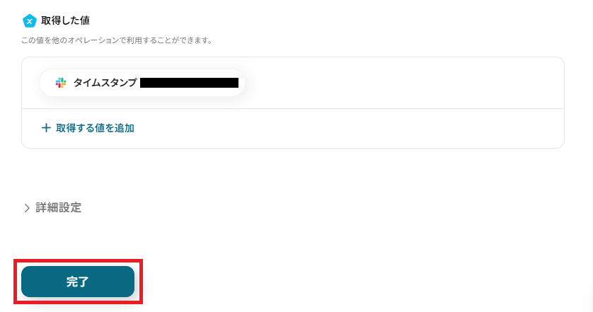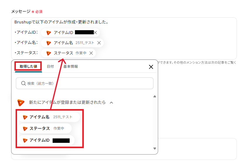 「メッセージ」は取得した値を引用し、通知する内容を作成しましょう。