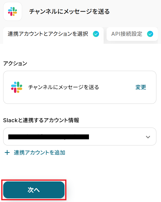 ステップ3と同様、アクションは「チャンネルにメッセージを送る」のまま「次へ」をクリックします。