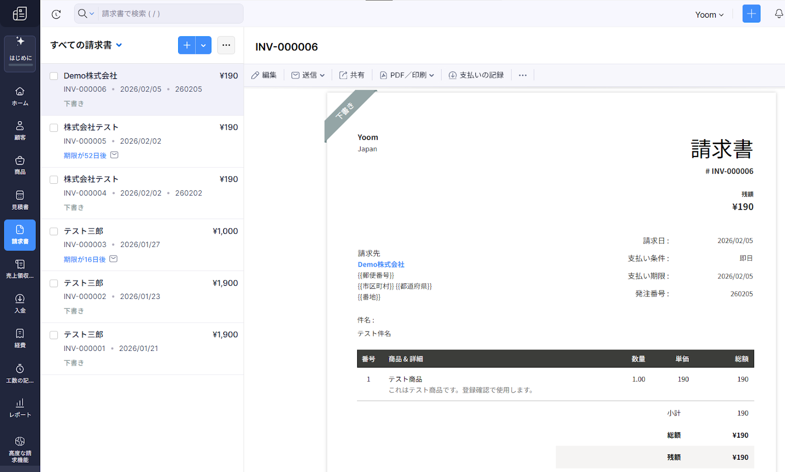 はじめに、Zoho Invoiceでテスト用の請求書を作成しましょう。