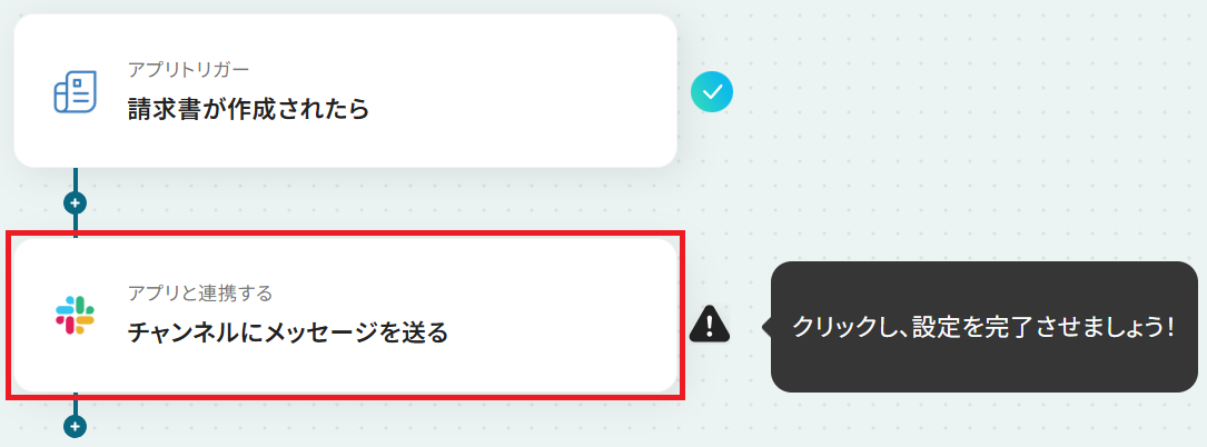 - 最後に、オペレーションでSlackの「チャンネルにメッセージを送る」アクションを設定し、請求書作成の通知を送信します。