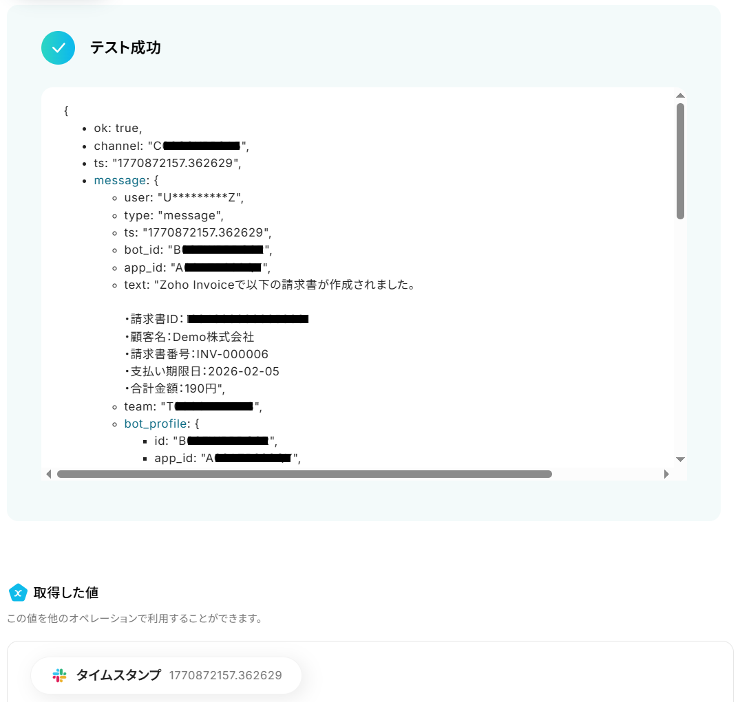 先ほど取得した請求書情報をSlackで通知します。