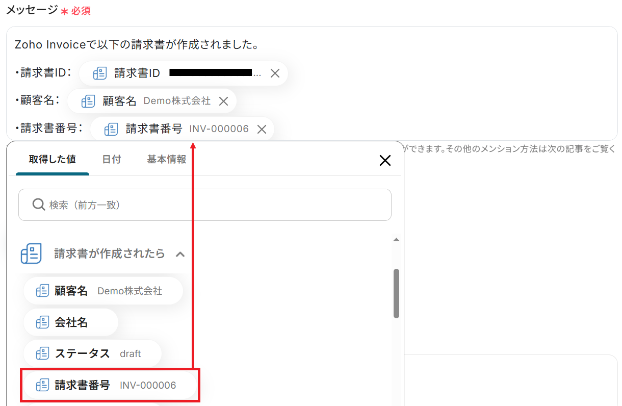 - 通知メッセージの本文も自由にカスタマイズできます。Zoho Invoiceから取得した請求書番号や顧客名などの情報を含めることで、より分かりやすい通知を作成できます。