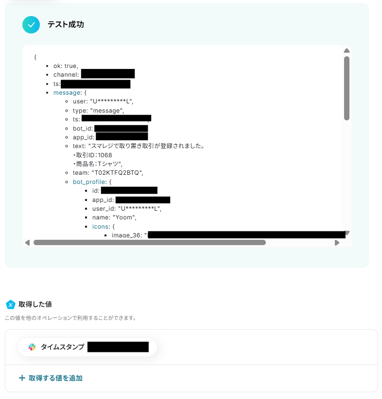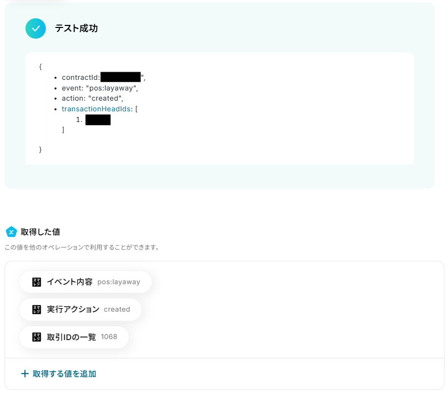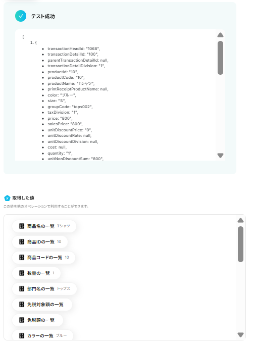 ここまで設定できたら、「テスト」をクリックします。 テストが成功して、スマレジに登録した取り置き取引の詳細情報を取得できました。 「完了」をクリックして設定完了です!