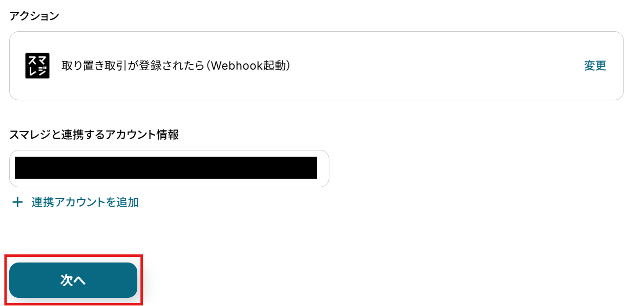 クリックすると以下の画面に移ります。 アカウント情報と書かれた項目にはステップ1でマイアプリ連携した際のアカウント情報が記載されています。 トリガーアクションは、「取り置き取引が登録されたら(Webhook起動)」のままで次に進みましょう!