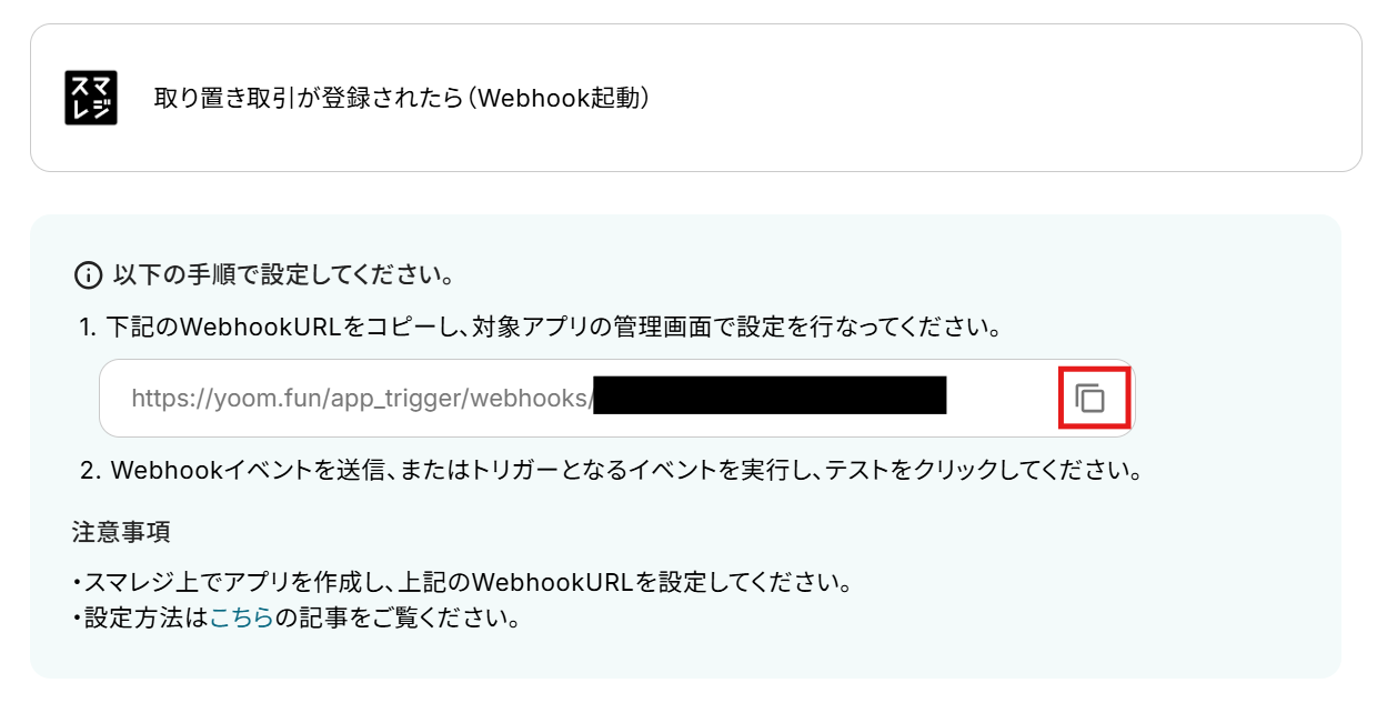まずスマレジのアクションをYoomと連携するために、スマレジにWebhookを設定します。 設定方法の詳細については、以下のリンクをご参照ください。