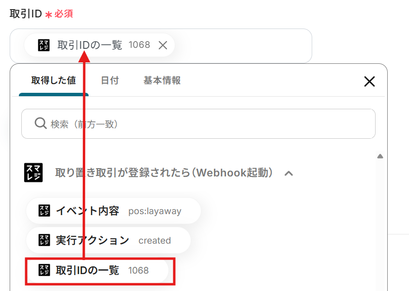 編集欄をクリックして、「取り置き取引が登録されたら(Webhook起動)」から「取引IDの一覧」を選択してください。 ※デフォルトで入力されている「←トリガーで取得した値を設定してください」は削除してくださいね!