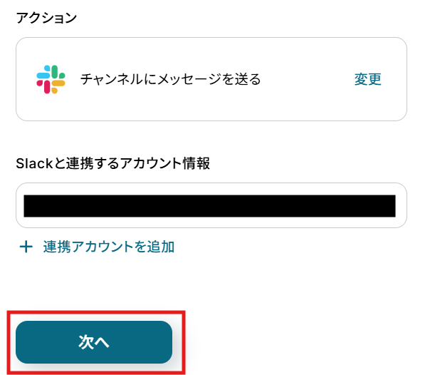 クリックすると以下の画面に移ります。 スマレジと同様に、ステップ1でマイアプリ連携したSlackのアカウント情報が自動で表示されます。 アクションは、「チャンネルにメッセージを送る」のままで次に進みましょう!