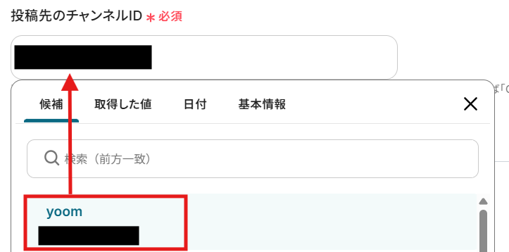 スマレジに取り置き取引が登録されたことを通知するチャンネルIDを入力します。 編集欄をクリックすると、Slackのチャンネル候補が表示されるので、そこから対象のチャンネルを選択してください。 選択するとIDが自動で入力されます。 ※事前に該当のチャンネルの「インテグレーション」からYoomを追加しておいてくださいね!