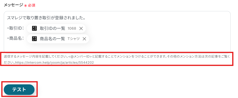 赤枠の説明の通り、メンションをつけることも可能です! メッセージの入力が完了したら「テスト」をクリックします。