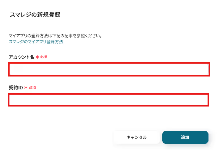 1.スマレジのマイアプリ連携 アプリ一覧からスマレジを検索して選択すると、下記の画面が表示されます。 アカウント名と契約IDを入力して、「追加」をクリックしてください。