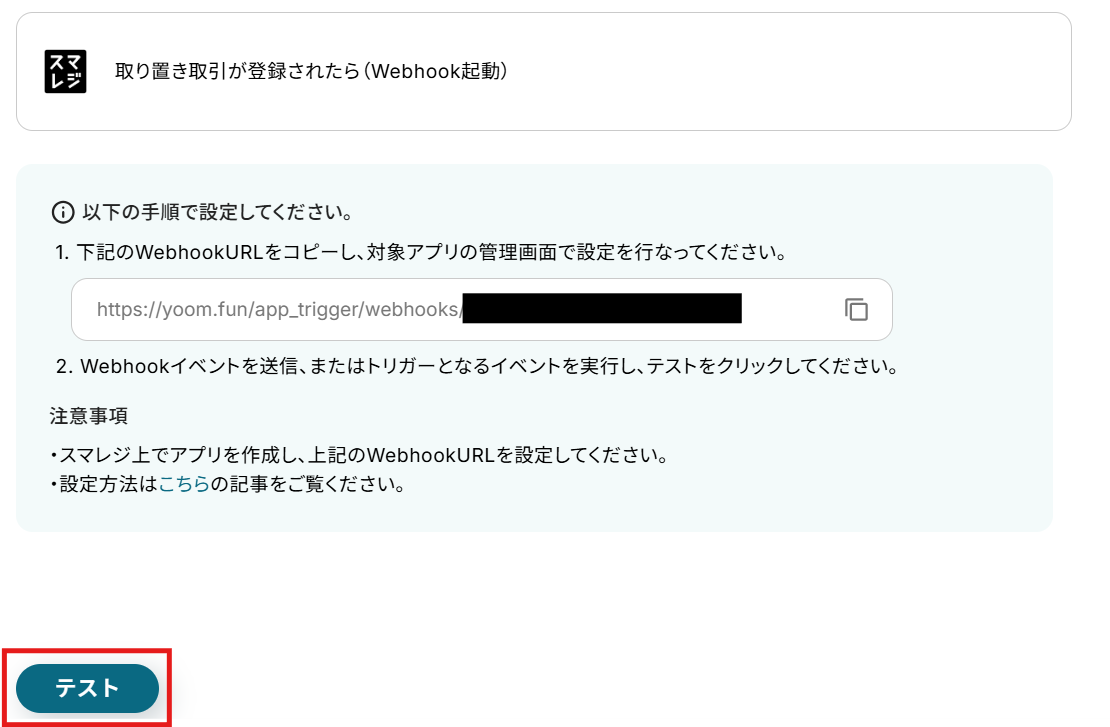 Webhookの設定が完了したら、スマレジにテスト用の取り置き取引を登録しましょう! 取り置き取引を登録したら、Yoomの操作画面に戻り「テスト」をクリックしてください。