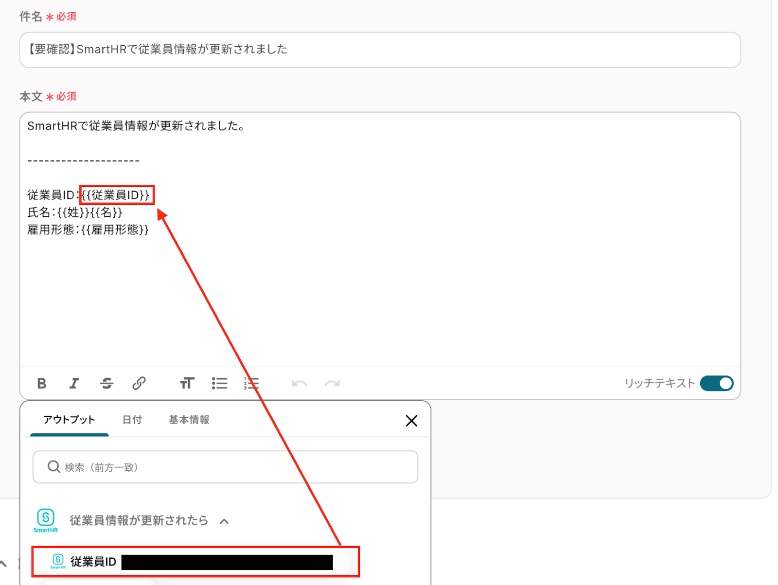 4.以下の画像は、「本文」の項目で入力欄をクリックして表示されるアウトプットを活用して設定したものです。