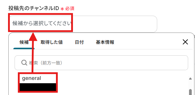 「投稿先のチャンネルID」を候補から選択しましょう。