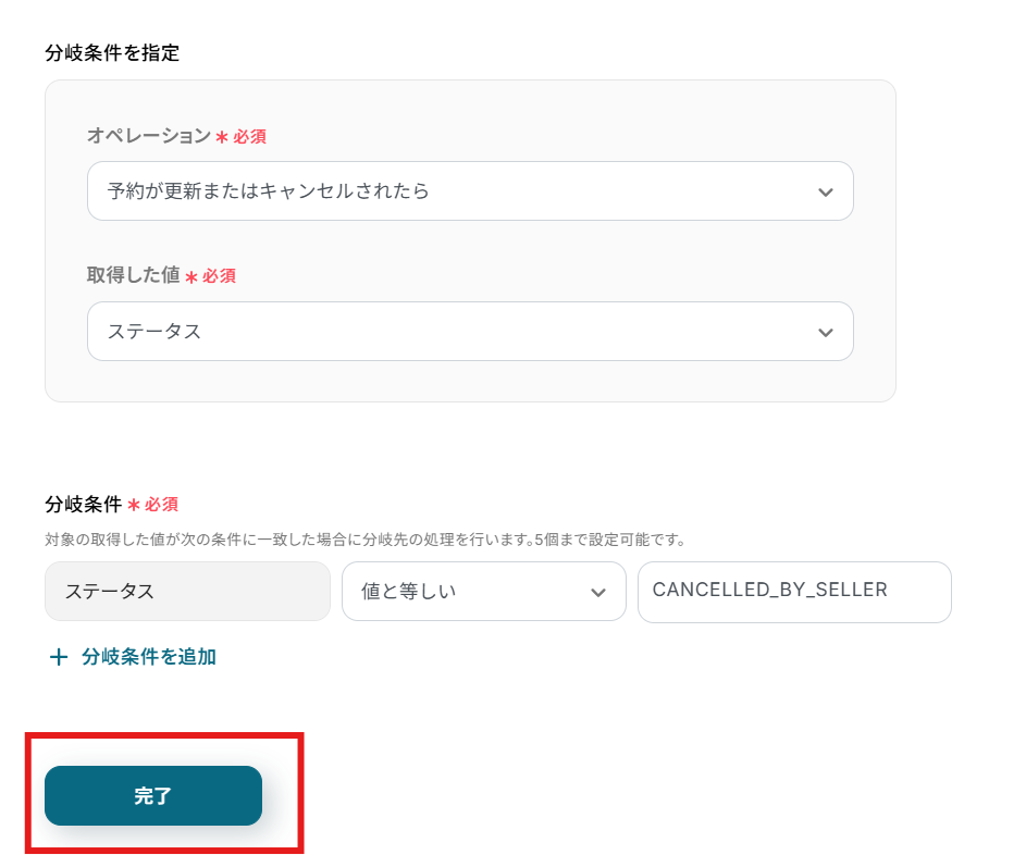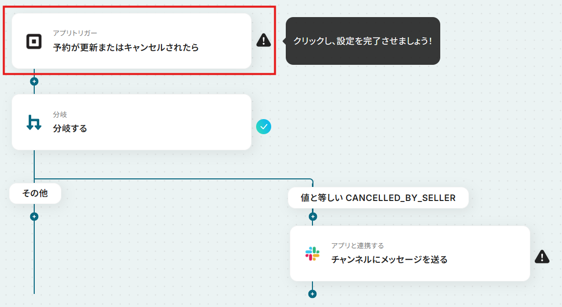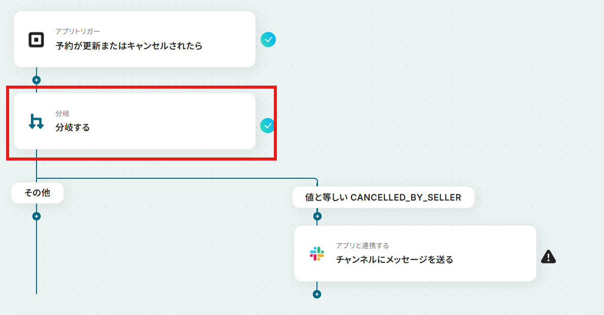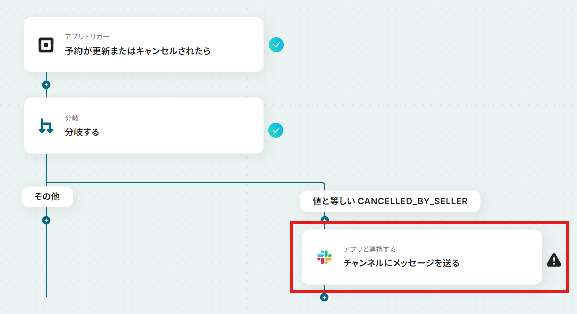 今回はSquareで予約がキャンセルされた時を想定したフローですので、「ステータス」の値が「CANCELLED_BY_SELLER」であるか否かで分岐するように設定されています。