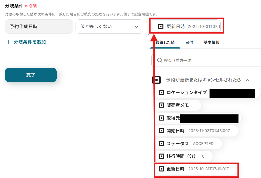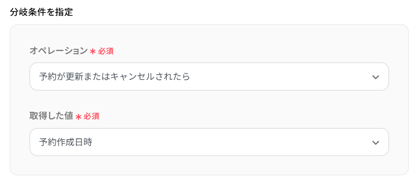 A:はい、可能です!予約が「キャンセル」ではなく「変更」された時に通知したい場合は、分岐条件を「予約作成日時」と「更新日時」の値が等しくないか否かに設定しましょう。