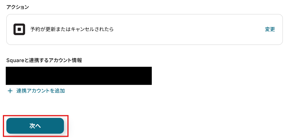 「Squareと連携するアカウント情報」を確認し、「次へ」をクリックして進んでください。
