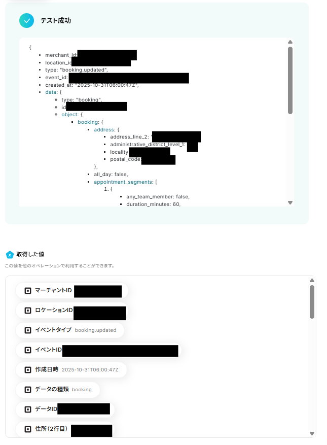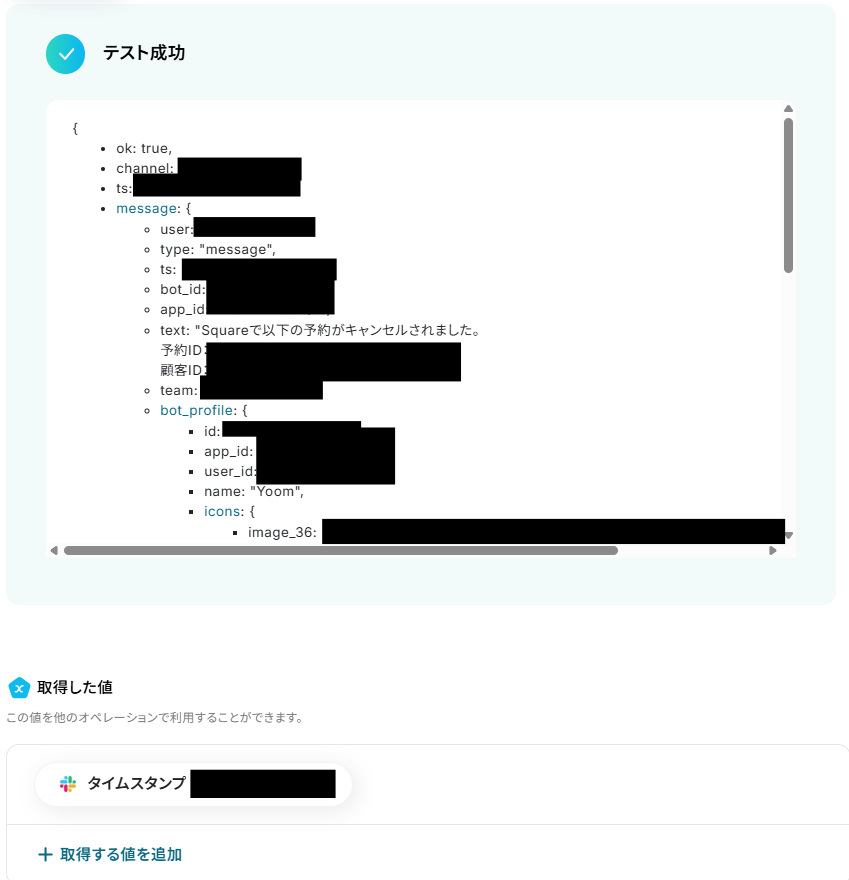 テストに成功すると「取得した値」に反映されます。詳しくは以下をご覧ください。