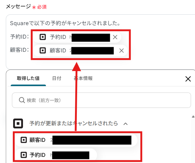 今回は固定のテキストと「取得した値」を用いて以下のように設定しました!