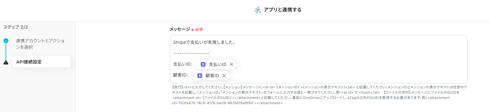 - メンションを設定する場合は、メッセージ編集エリアの下の、メンション値を紐付けするボックスに値を入力します。添付ファイル情報も同じく値を挿入します。